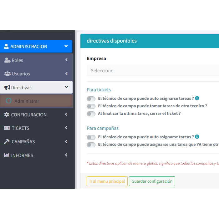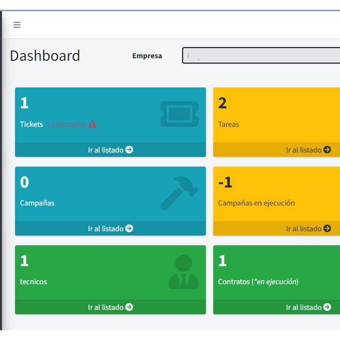 Trabajamos bajo tickets que agrupan las tareas, estas tareas son ejecutadas por los técnicos de campo, los tecnicos de campo pueden ser generalistas o especializados.